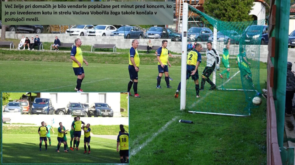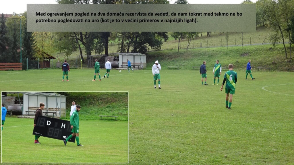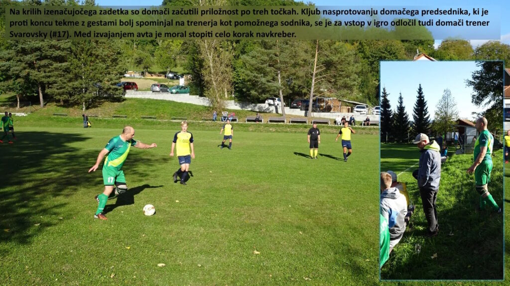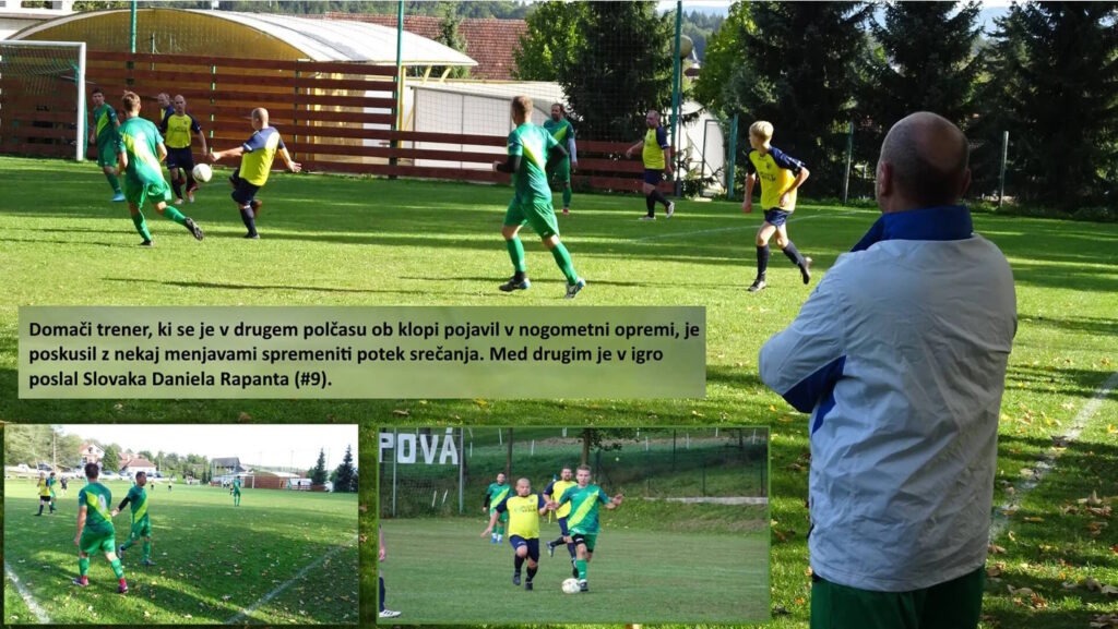 Domači trener v zadnjih minutah na igrišču ni prinesel želenega preobrata. Roko na srce, privoščil si je celo nekaj izgubljenih žog, kar je takoj po zadnjem sodniškem žvižgu domačega predsednika povsem vrglo iz tira. Sodniško zastavico je z vso močjo vrgel ob tla in odhitel v kiosk. Nekaj trenutkov za tem je na polico postavil lonec iz katerega si je vsakdo lahko potešil svojo lakoto. Ali gre za običajno prakso ali pa je bilo vse skupaj posledica spleta okoliščin, tisti trenutek nisem imel volje poizvedovati. Vsekakor pa gre za zanimivega človeka s sicer rahlimi živci, ki tudi v najnižji ligi daje prednost tekmovalnosti pred sodelovanjem. Uro po tekmi je z njim sledil zanimiv pogovor o spominih na tekmo Olimpije s Trenčinom, kako ne prenese bratislavski Slovan…